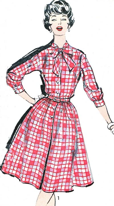Advance 2829; ca. 1963; F ront button shirtdress has a full skirt, long cuffed or short set-in sleeves and bow collar. Self fabric belt.