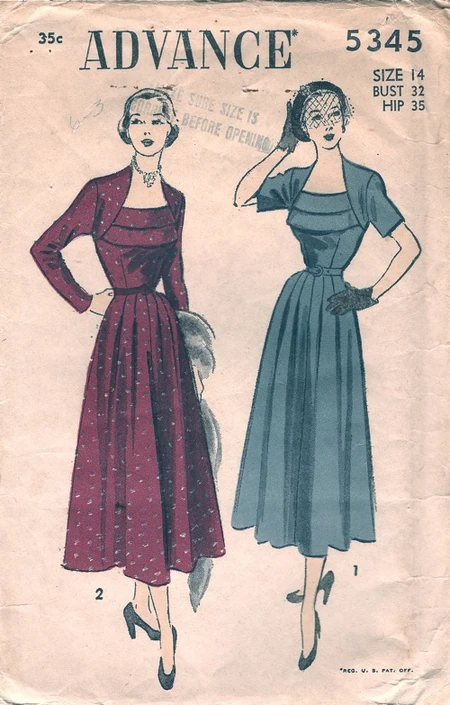 Advance 5345; ca. 1949; View 1, Dress with Short Sleeves - Self Belt. View 2, Dress with Long or Three-quarter Sleeves - Purchased Belt.