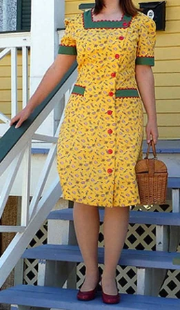 American Weekly 3740; ca. 1940s: Misses' and Women's six-gore princess-seamed dress with full-length, left-front button closure. Has short or long sleeves with darted sleeve caps, patch pocket, and optional contrast trim.