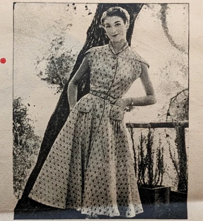 Bestway D.2,265; ca. 1953; Norman Hartnell for Woman's Illustrated - Dress. The wide back of the bodice of this button-through dress extends over the shoulders to form yokes and sleeves. The circular, gathered skirt is trimmed with novel pockets made of double layers of material stitched together to form bags and attached along top edges only.