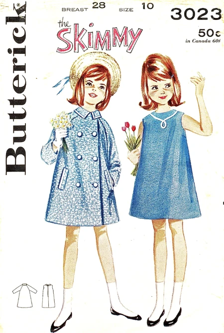 Butterick 3023; ca. 1964; Girls' Skimmy Dress & Coat. Slightly A-shaped skimmy dress with braid trim. Raglan sleeved, A-shaped, double breasted coat with Johnny collar, pockets, braid trim.