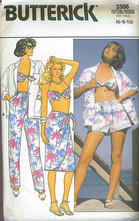 Butterick 3306; ©1985; Misses' Shirt, Skirt, Pants, Shorts & Bra. Loose fitting shirt has notched collar, extended shoulders, pockets and short or long sleeves rolled up (wrong side shows). Hems are stitched in place. Straight, wrap skirt, below mid knee, has no waistband or side seams, attached tie ends (wrong side shows), and shaped hemline. Narrow hem. Tapered pants or shorts have drawstring waist. Pants: side pockets and stitched hem. Shorts: narrow hem. Halter bra is self lined.