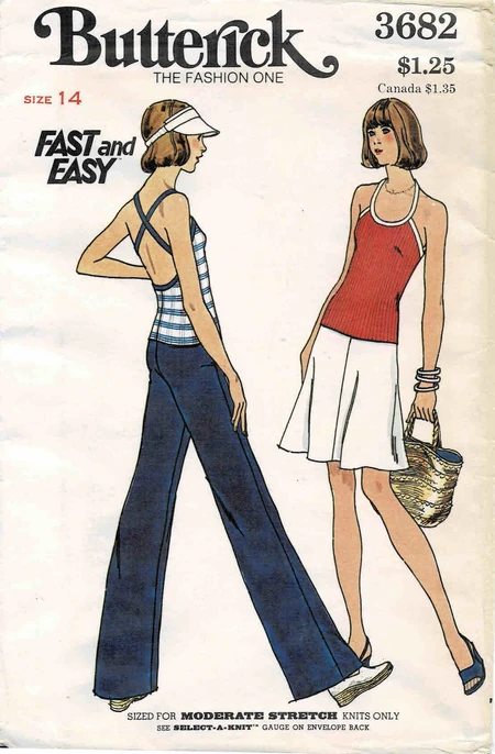 Butterick 3682; ca. 1974; Misses' Top, Skirt & Pants: Close-fitting halter top, with purchased foldover braid finish has scoop neckline extending into back straps. Fitted and slightly flared skirt and straight-legged pants have elasticized waistline.