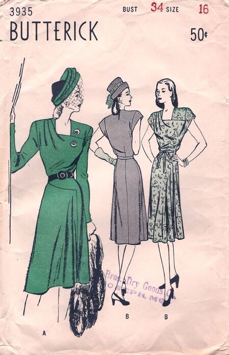 Butterick 3935; ca. 1946; Women's and Misses' Soft Daytime Dress. Softness sweeping from the right shoulder of this one-piece dress harmonizes with the detail on the opposite side of the graceful skirt. Slightly deeper armhole sleeves in long length, A; cap sleeves, view B. The skirt has a three-gore back.