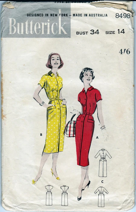 Butterick 8498; ca. 1958; Misses' Step-In Spectator. Year 'round spectator step-in with V-neck, Johnny collar and welt pockets. (A) Braid bound front, collar and cropped sleeves. (B) Untrimmed version. (C) Three-quarter sleeved view.