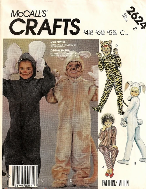 McCall's 2624; ©1986; Boys' and Girls' Animal Costume: Front zippered costume with or without lined, detachable headpiece has raglan sleeves. Mittens and optional boots have elastic in casings. A and D have ribbon bow. B has pom-poms. C and D have stuffed tail.