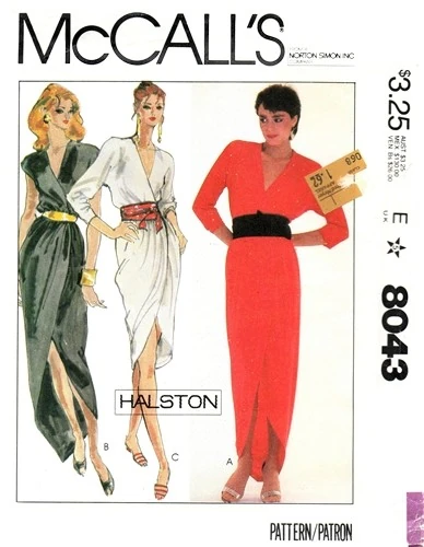 McCall's 8042; ©1982; Halston - Misses' Dress & Sash: Front-wrap dress in two lengths has waistline gathers, set-in waistband, shaped hemline. Dress A and C have full-length dolman sleeves with optional wrist elastic. B has extended shoulders. Obi-sash and purchased belt are optional.