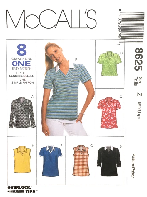 McCall's 8625; ©1997; Misses' Tops. Pullover top with or without long or short sleeves has V-neckline with band and collar.