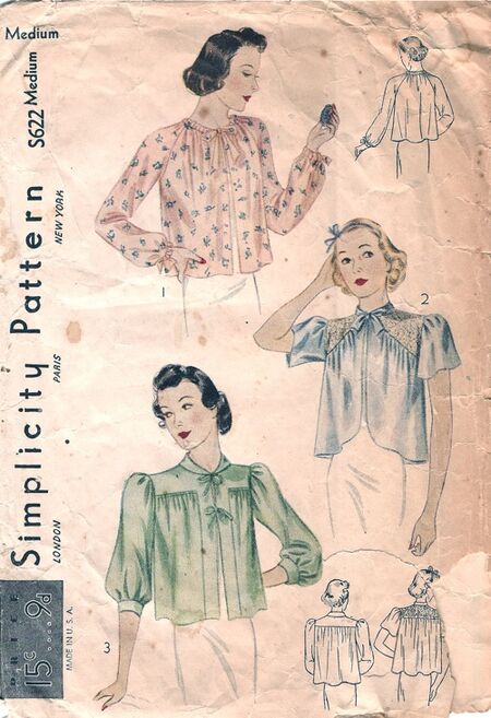 Simplicity S622; ca. 1930s; Set of Bed Jackets. Style I has draw-string neckline. Full sleeves tied at the wrist with ribbons in draw-string effect. Style II has shaped front yoke and straight back yoke. Collar ties with bow. Short gathered sleeves. Style III has straight yoke continuing into the band. Small turnover collar fastens at the front with two bows. hree-quarter length sleeves gathered to a narrow band.